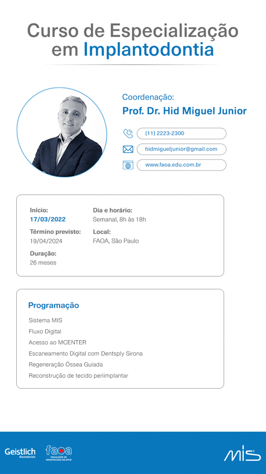 Inscreva-se agora para o Curso de Especialização em Implantodontia com o Prof. Dr. Hid Miguel Junior. Com início em março, o curso tem como objetivo a formação de um profissional com completo fundamento na prática da Implantodontia.